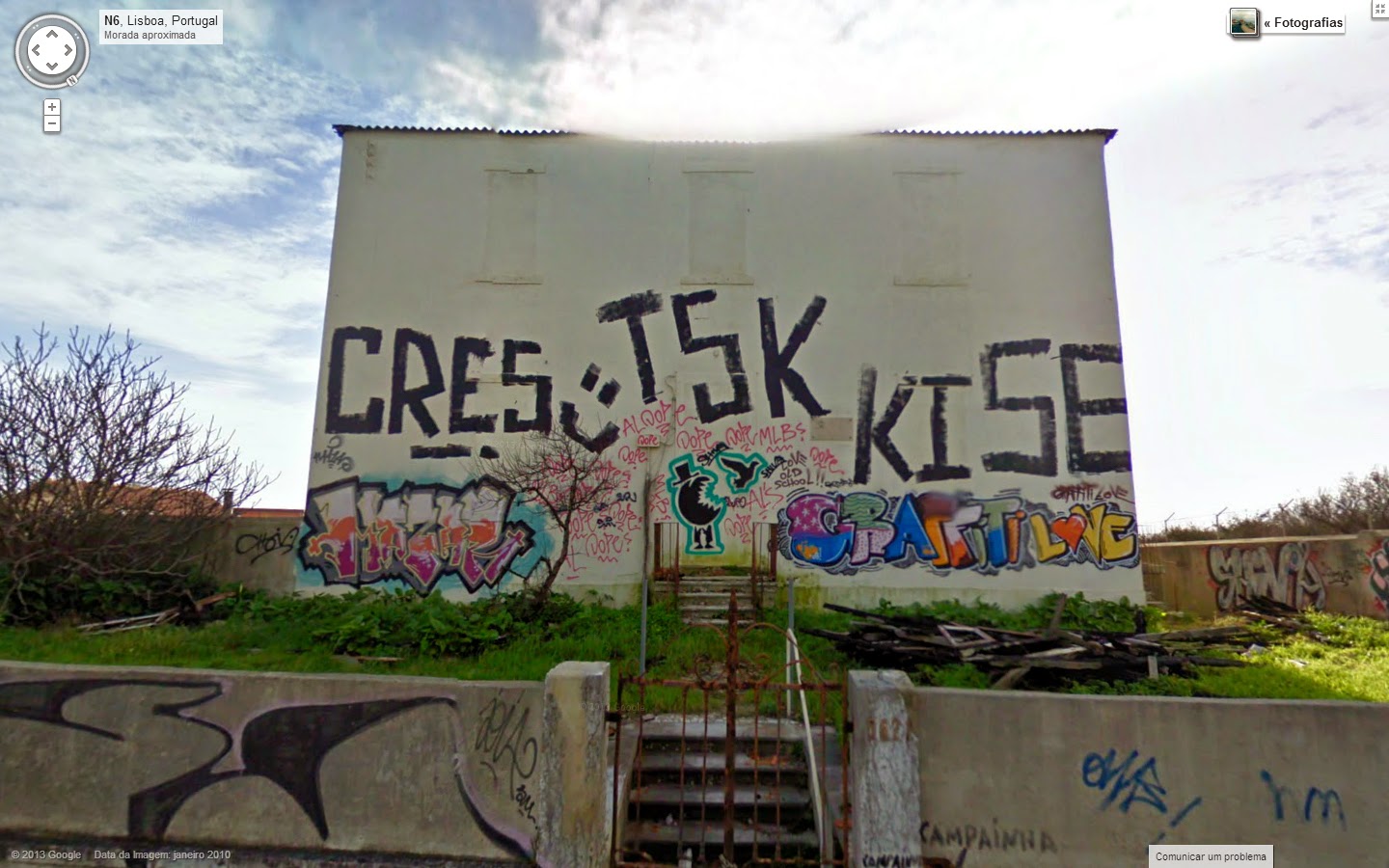 Já foi há muitos anos que os desenhos a tinta estrearam-se nesta parede. Tivemos a satisfação de estar lá nesse momento. O Google Street View, já várias vezes citado neste blog, captou em 2010 a aparência da fachada principal que ainda hoje se mantém praticamente inalterada. A parte desatualizada desta fotografia é o muro junto à estrada que entretanto já recebeu intervenções corajosas de bons Artistas, dentre os quais destacamos o amigo SEGA, cujo lettering imaginativo pode ser encontrado em todos os cantos da cidade.